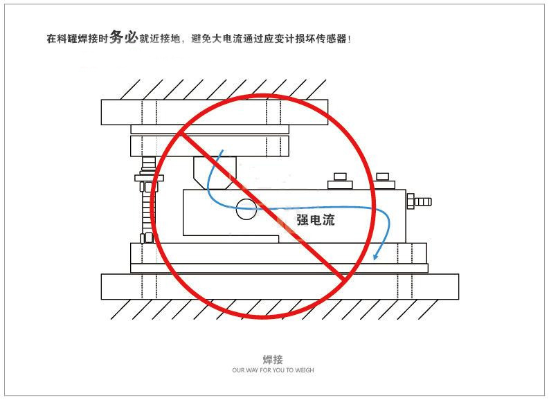 (2)焊接時傳感器不能通過電流,焊接頂板時,地線要連接在秤體上,焊接底板時,地線要接在基礎(chǔ)上,防止損壞傳感器。