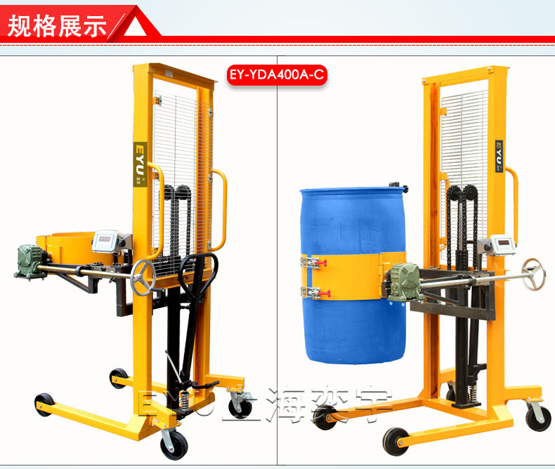 產(chǎn)品賣點(diǎn):帶電子秤稱重油桶翻轉(zhuǎn)倒料車有三款:EY-YDA400A-C叼扣式用于鐵桶400kg,EY-YDA400B-C抱箍式用于塑料桶450kg EY-YDA450-C夾抱式鐵塑兩用載重450kg三款都是升高1500mm.電子秤設(shè)立在側(cè)面,易觀察,稱重過后,你可以放心升高,內(nèi)部傳輸稱重?cái)?shù)據(jù),升高降低,不影響稱重。適合油桶搬運(yùn)、升高、稱重、倒料使用。